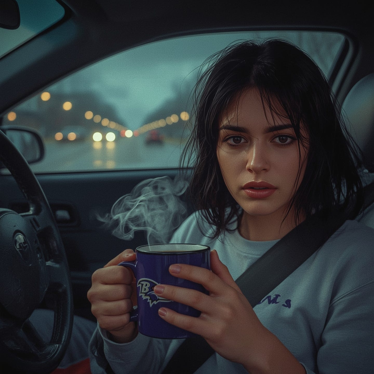 She settled her Ravens mug into the cup holder. Coffee steam rose in lazy spirals. The Saturn’s door creaked its familiar complaint, but the engine turned over without protest, settling into its reliable rumble. Small mercies.